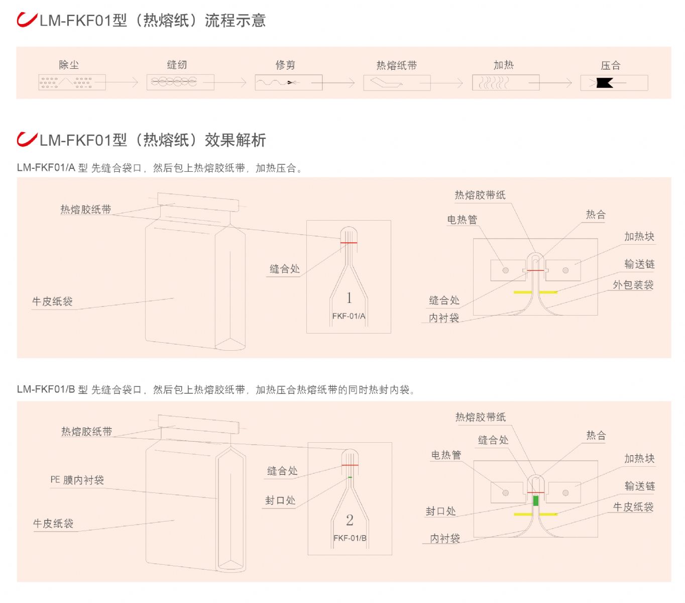 LM-FKF系列連續(xù)式縫包熱合封口機(jī)適用于聚酯編制袋、牛皮紙袋、多層紙袋或紙塑復(fù)合袋的封口包裝,該機(jī)可按編程自動(dòng)完成包裝袋袋口的除塵、修剪、縫合、剪線辮、包紙帶、剪紙帶、熱封、壓合、計(jì)數(shù)等工序。經(jīng)封口、縫合、包紙帶、熱壓的包裝袋密封性能極佳,可防塵、防蛀、防潮、防污染,使包裝物受到妥善的保護(hù)。